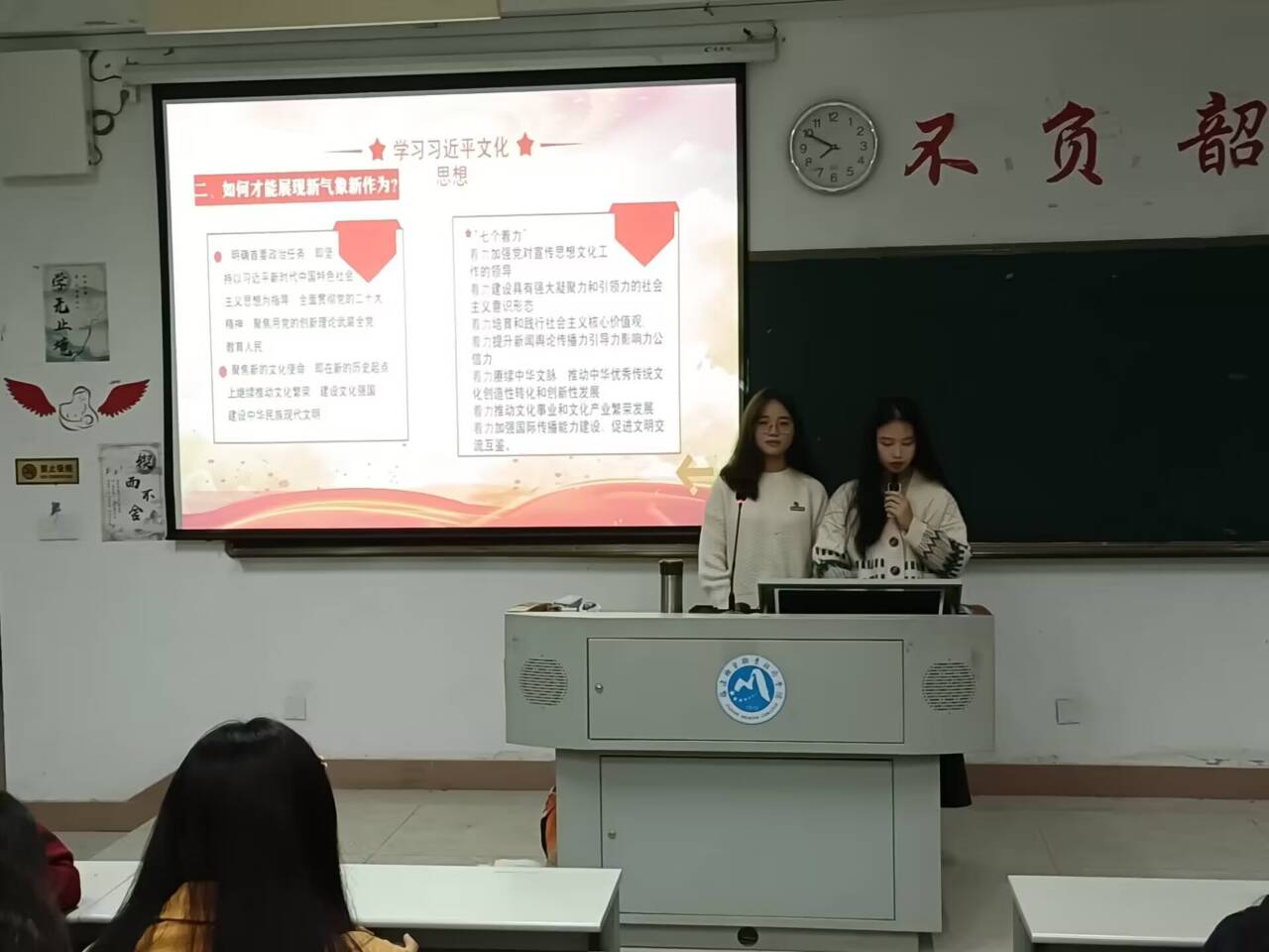 本次宣講人是22護(hù)理314的王雪蓮和23護(hù)理309的周詩(shī)妍,宣講的主題是“學(xué)習(xí)習(xí)近平文化思想,爭(zhēng)做新時(shí)代好青年”。王雪蓮首先從全國(guó)宣傳思想文化工作會(huì)議的召開(kāi)入手,闡明習(xí)近平文化思想的由來(lái)和新發(fā)展,接著由周詩(shī)妍宣講,她從新青年與醫(yī)學(xué)專(zhuān)業(yè)的聯(lián)系出發(fā),呼吁我們當(dāng)代青年擔(dān)起自己肩上的重任,為人民健康事業(yè)的發(fā)展貢獻(xiàn)自己的青春力量。最后,胡濟(jì)林進(jìn)行精彩點(diǎn)評(píng),希望同學(xué)們通過(guò)此次演講更加深入理解習(xí)近平文化思想,踐行社會(huì)主義核心價(jià)值觀,創(chuàng)建積極健康向上的校園文化。最后,本次宣講小組成員與老師合照。