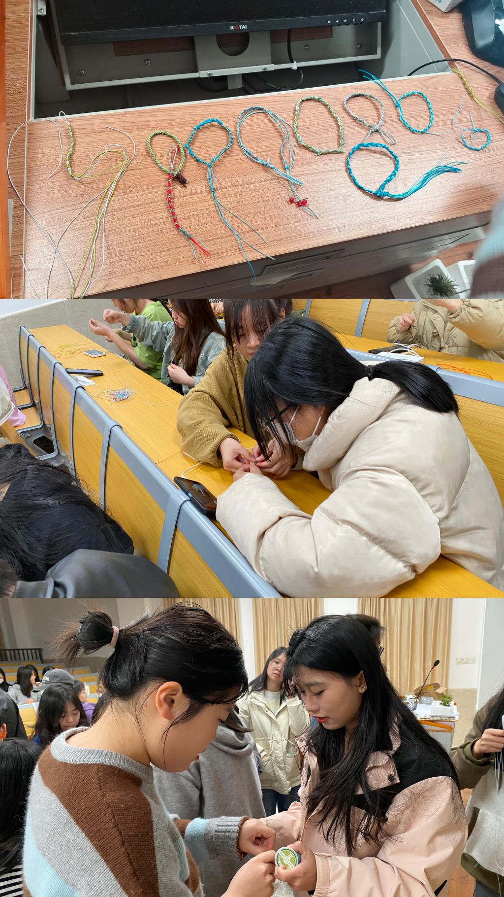 日月陽陰兩均天,玄鳥不辭桃花寒。本次活動以“春”為主題,五人一組編織手繩,領(lǐng)取手繩材料后,在規(guī)定時(shí)間內(nèi)自由發(fā)揮編織完成作品。