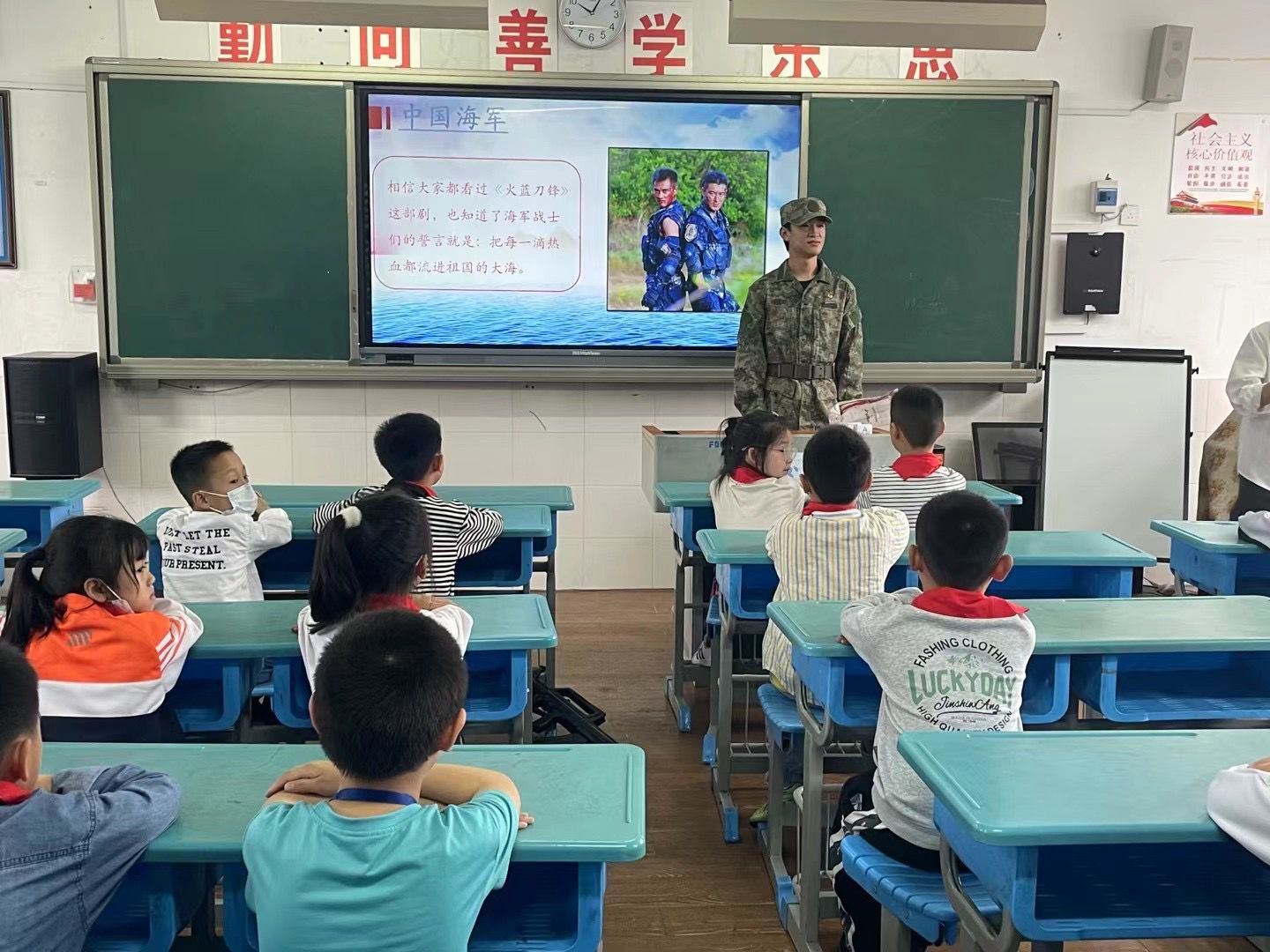 活動(dòng)開(kāi)始,由八一學(xué)社兩名退役大學(xué)生何宏祥、湯昊分別從中國(guó)人民解放軍的發(fā)展歷史和基本國(guó)防知識(shí)問(wèn)答兩方面對(duì)小學(xué)生進(jìn)行“愛(ài)我國(guó)防 強(qiáng)國(guó)有我”為主題的國(guó)防教育宣傳宣講。宣講過(guò)程中,同學(xué)們?nèi)褙炞⒌芈?tīng)講并積極配合舉手發(fā)言。這些互動(dòng)給小學(xué)生們心中埋下了保家衛(wèi)國(guó)的夢(mèng)想的種子。