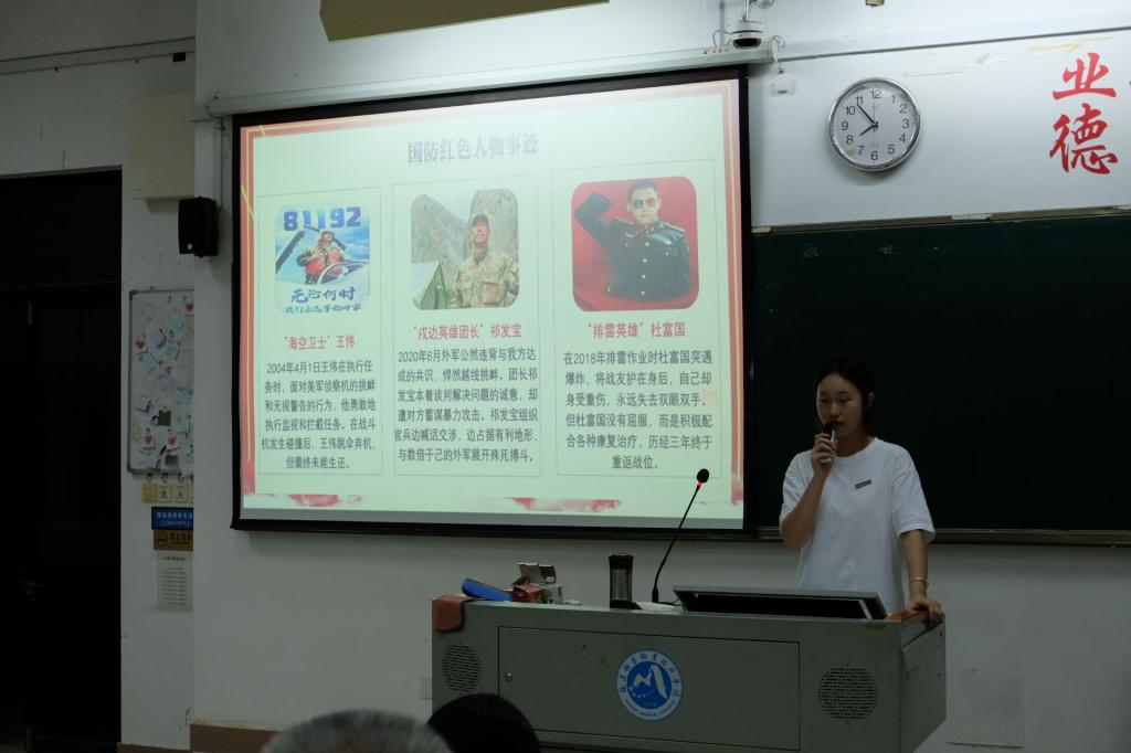 本次宣講小組成員是23中藥301班的陳瑩和王紫欣,宣講人是陳瑩,她宣講的主題是“強(qiáng)國(guó)復(fù)興,愛我國(guó)防”。陳瑩首先向大家講述了國(guó)防建設(shè)的涵義,接著從國(guó)防紅色故事、國(guó)防事業(yè)發(fā)展歷程兩個(gè)方面來展開講述,她通過播放微視頻,讓同學(xué)們領(lǐng)略我國(guó)國(guó)防力量從追趕、并跑再到領(lǐng)跑的偉大成就,最后結(jié)合大學(xué)生實(shí)際,提出八點(diǎn)行動(dòng)建議。胡濟(jì)林進(jìn)行精彩點(diǎn)評(píng),希望同學(xué)們能通過這一宣講,堅(jiān)定理想信念,為實(shí)現(xiàn)中國(guó)國(guó)防事業(yè)貢獻(xiàn)青春力量。