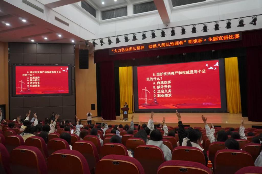 活動以“深化憲法認(rèn)知、提升法治素養(yǎng)”為核心目標(biāo),既助力參與者筑牢憲法認(rèn)同、錘煉法治思維與宣講表達(dá)能力,推動憲法精神從理論認(rèn)知向行動踐行轉(zhuǎn)化;更以活動為紐帶,帶動更多同學(xué)主動學(xué)法知法,營造校園尊憲護(hù)憲的濃厚氛圍,厚植青年學(xué)子的法治信仰與責(zé)任擔(dān)當(dāng),夯實德育與法治教育根基?,F(xiàn)場設(shè)置憲法知識競答環(huán)節(jié),觀眾積極搶答,互動熱烈,氛圍輕松活躍;決賽階段,選手依次登臺宣講,展現(xiàn)對“憲法+八閩”主題的深刻理解?;顒游猜?,評委圍繞“主題契合度、內(nèi)容創(chuàng)新性、價值引領(lǐng)力”三大維度綜合考評打分,最終評選出一等獎1名、二等獎2名、三等獎3名。