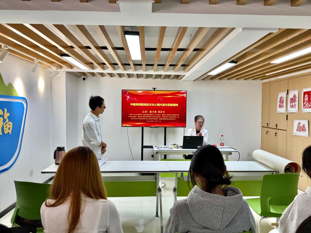 活動(dòng)伊始,潘力鷹為現(xiàn)場(chǎng)師生帶來了題為《中國(guó)民間剪紙的文化心理內(nèi)涵與民族精神》的精彩講座。她首先從非遺剪紙的文化定位出發(fā),闡釋了其作為中華文明活態(tài)傳承的重要載體地位。隨后,她結(jié)合豐富的剪紙作品深入剖析了剪紙作為集體潛意識(shí)情感表達(dá)的獨(dú)特方式,指出其紋樣符號(hào)中蘊(yùn)含著人民群眾對(duì)美好生活的向往、對(duì)自然的敬畏及對(duì)倫理秩序的遵循,這正是馬克思主義唯物史觀中“人民群眾是歷史創(chuàng)造者”的生動(dòng)文化例證。潘會(huì)長(zhǎng)進(jìn)一步闡明,剪紙藝術(shù)是民族精神的形象化載體,方寸之間凝聚著自強(qiáng)不息、和諧共生、祈福納祥等中華民族的核心精神特質(zhì),與社會(huì)主義核心價(jià)值觀一脈相承。最后,她強(qiáng)調(diào)了剪紙?jiān)诋?dāng)代守護(hù)民族文化基因、堅(jiān)定文化自信方面不可替代的價(jià)值,為同學(xué)們上了一堂深刻而鮮活的“文化自信”思政課。