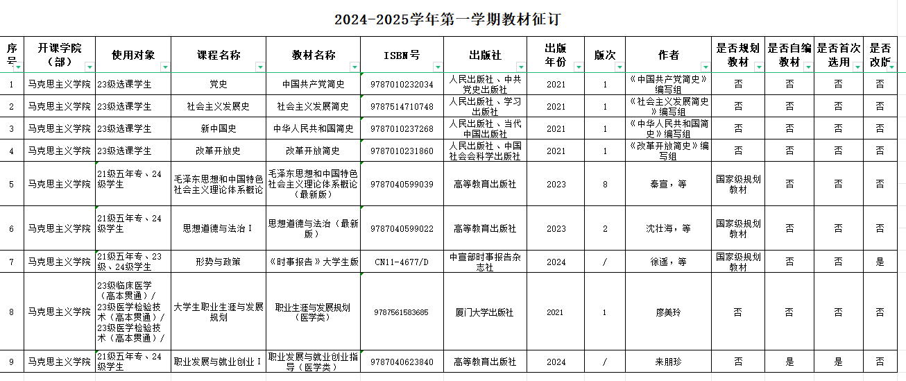 根據(jù)教務(wù)處下發(fā)的教材選用通知,經(jīng)各課程負(fù)責(zé)人、教研室主任初審,馬克思主義學(xué)院教材建設(shè)小組審核,擬定2024-2025學(xué)年第一學(xué)期教材選用情況如下: