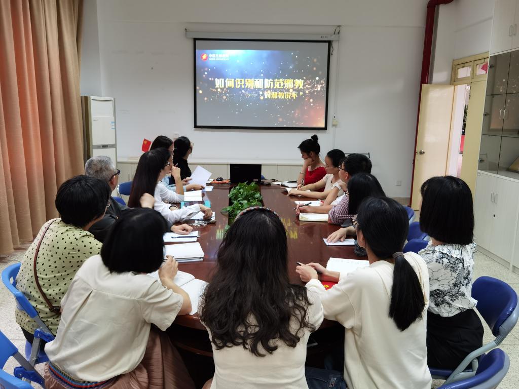 會(huì)上,組織兼紀(jì)檢委員楊盈首先傳達(dá)了《黨委宣傳部關(guān)于印發(fā)<“崇尚科學(xué) 遠(yuǎn)離病毒 防范邪教”>宣傳月活動(dòng)方案》的通知》等文件精神。接著,大家一起觀看了“中國反邪教網(wǎng)”視頻“如何識(shí)別和防范邪教——‘對(duì)邪教說不’”。