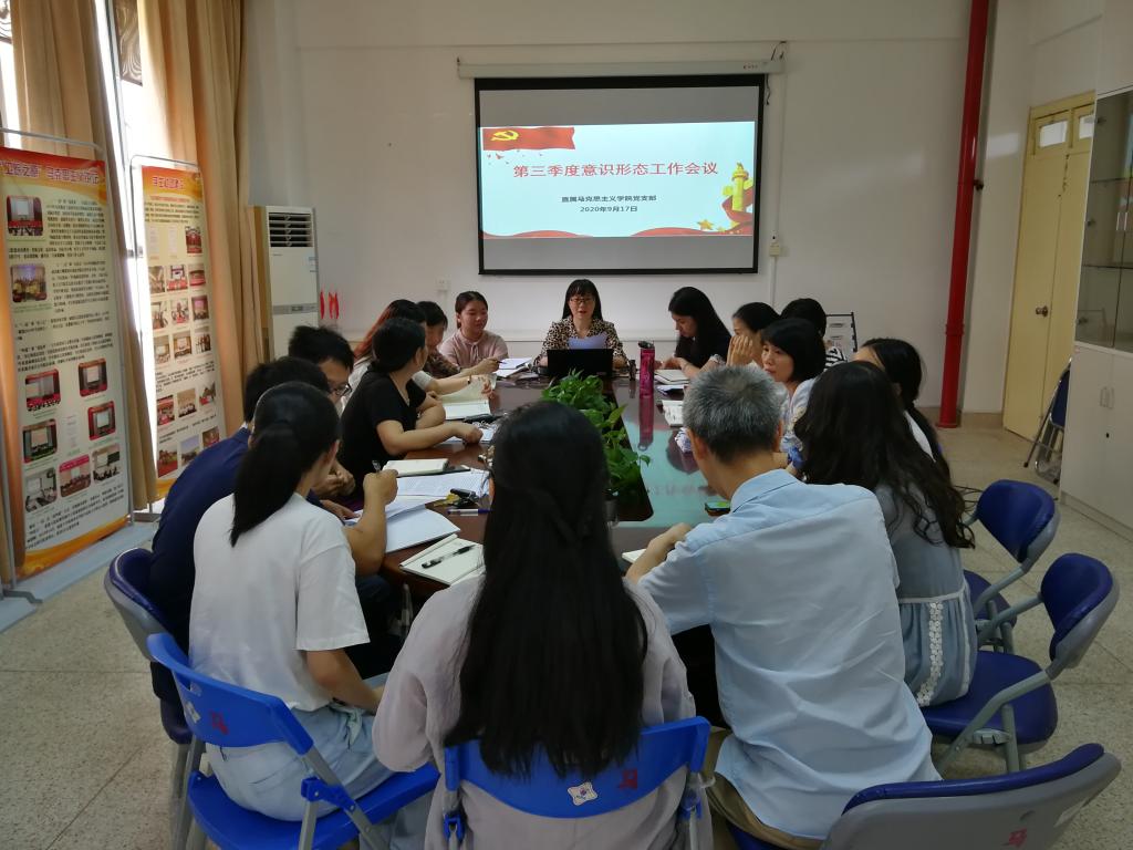 2020年9月17日上午,直屬馬克思學(xué)院黨支部在行政樓107馬院會(huì)議室召開(kāi)2020年第三季度意識(shí)形態(tài)工作會(huì)議。會(huì)議由直屬馬克思學(xué)院黨支部書(shū)記熊美蘭主持,直屬馬克思學(xué)院黨支部全體黨員參加了會(huì)議。