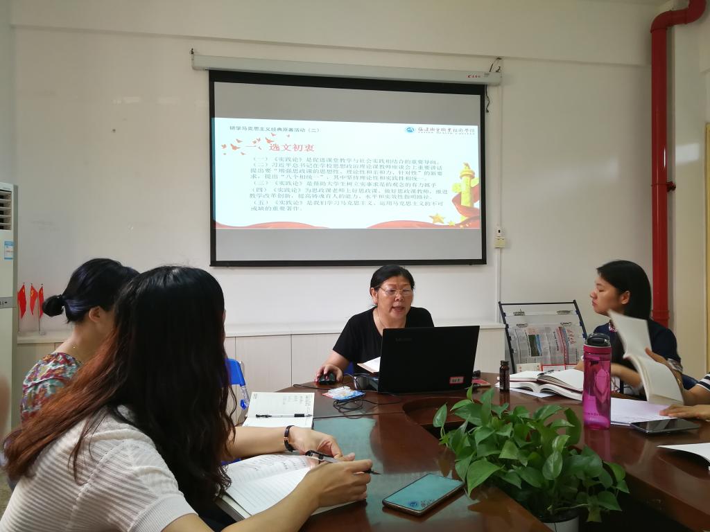 隨后,開(kāi)展了研學(xué)馬克思主義經(jīng)典原著活動(dòng)。本期的研學(xué)馬克思主義經(jīng)典原著活動(dòng)由魏立娜教授主講,她圍繞毛澤東的《實(shí)踐論》,結(jié)合實(shí)際工作,和老師們分享了學(xué)習(xí)體會(huì)。