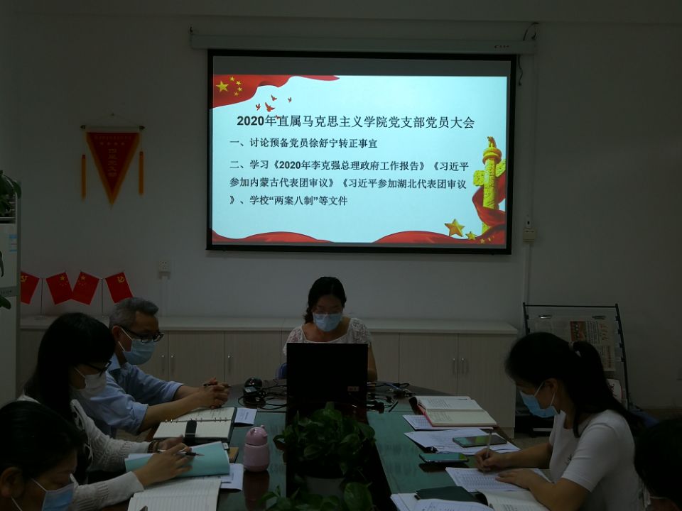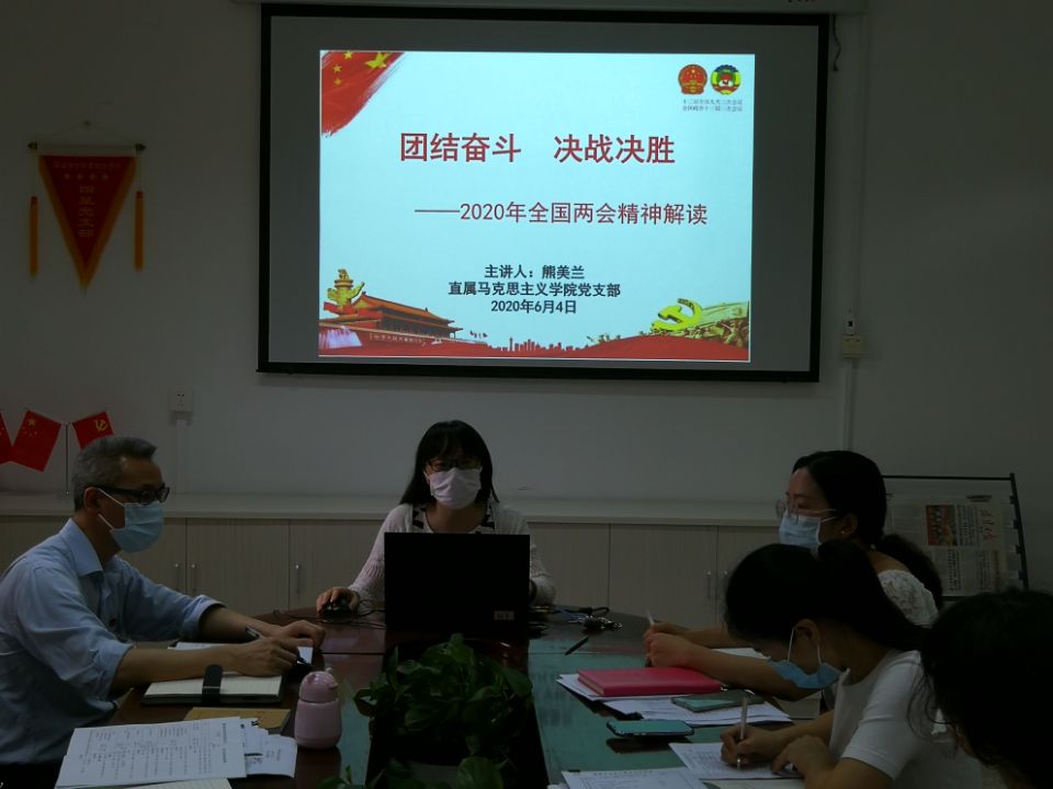 為深入學習2020年全國兩會精神,促進兩會精神貫徹到實際工作中,2020年6月4日,直屬馬克思主義學院黨支部在行政樓107開展了2020年全國兩會精神專題學習活動,全體黨員教師參加了活動。