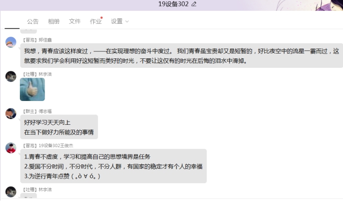 為弘揚(yáng)”五四”精神,展現(xiàn)新時(shí)代青年健康向上的精神風(fēng)貌,激發(fā)新時(shí)代青年向上向善,5月4日晚,指導(dǎo)教師邱萍為結(jié)對(duì)班級(jí)19設(shè)備302班舉辦“傳承五四薪火 綻放絢麗之花”講座,全班同學(xué)參加。