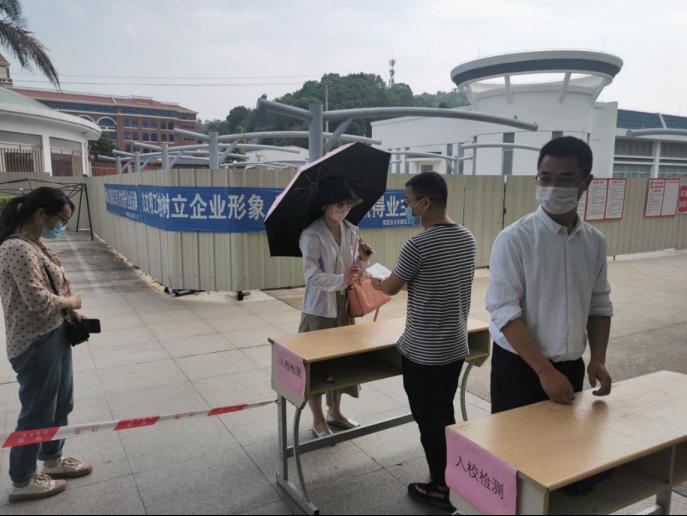 生下車按照地標(biāo)保持1米的距離排隊(duì),接受工作人員核驗(yàn)身份、檢查“閩政通”健康碼、測(cè)量體溫。經(jīng)測(cè)量體溫檢查正常后,學(xué)生按照地標(biāo)保持1米的距離排隊(duì)有序步行至校內(nèi)。