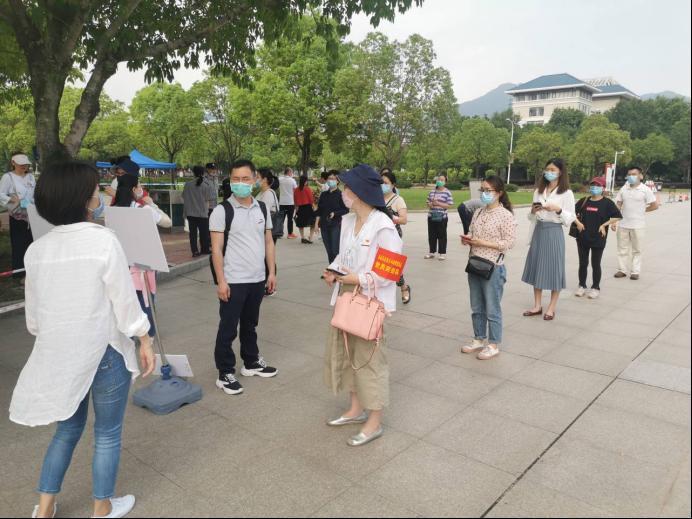 考生間隔1米排隊(duì)等待工作人員檢測(cè)。