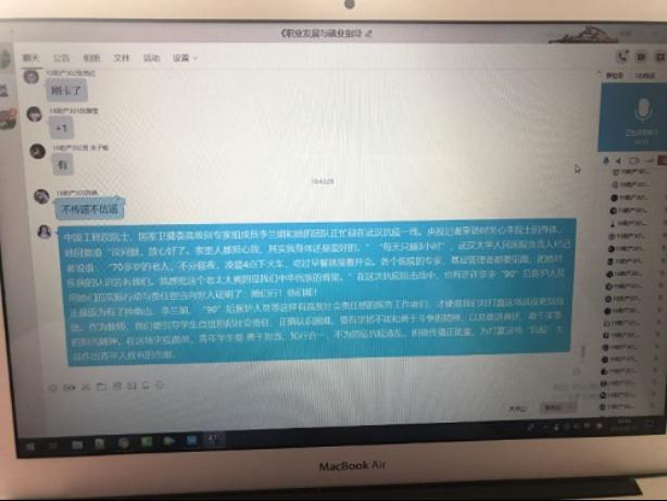 (圖為思政教師組織學(xué)生觀看抗擊疫情視頻,并與學(xué)生們開展線上互動討論)