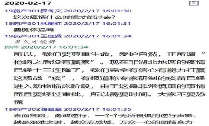 特殊時期的思政課堂上,馬院教師們通過語音溝通、線上答疑、轉(zhuǎn)發(fā)防控知識等方式,積極向?qū)W生科普預(yù)防新型冠狀病毒的相關(guān)知識,以馬克思主義哲學(xué)思維,引導(dǎo)學(xué)生樹立科學(xué)觀念,不聽謠、不信謠、不傳謠,并通過解讀習(xí)近平總書記關(guān)于新型黃莊肺炎疫情防控的重要講話精神以及政府出臺的各項措施,引導(dǎo)學(xué)生認識社會主義制度的優(yōu)越性,營造良好充滿正能量的輿論氛圍,從而堅定打贏疫情防控阻擊戰(zhàn)的信心。
