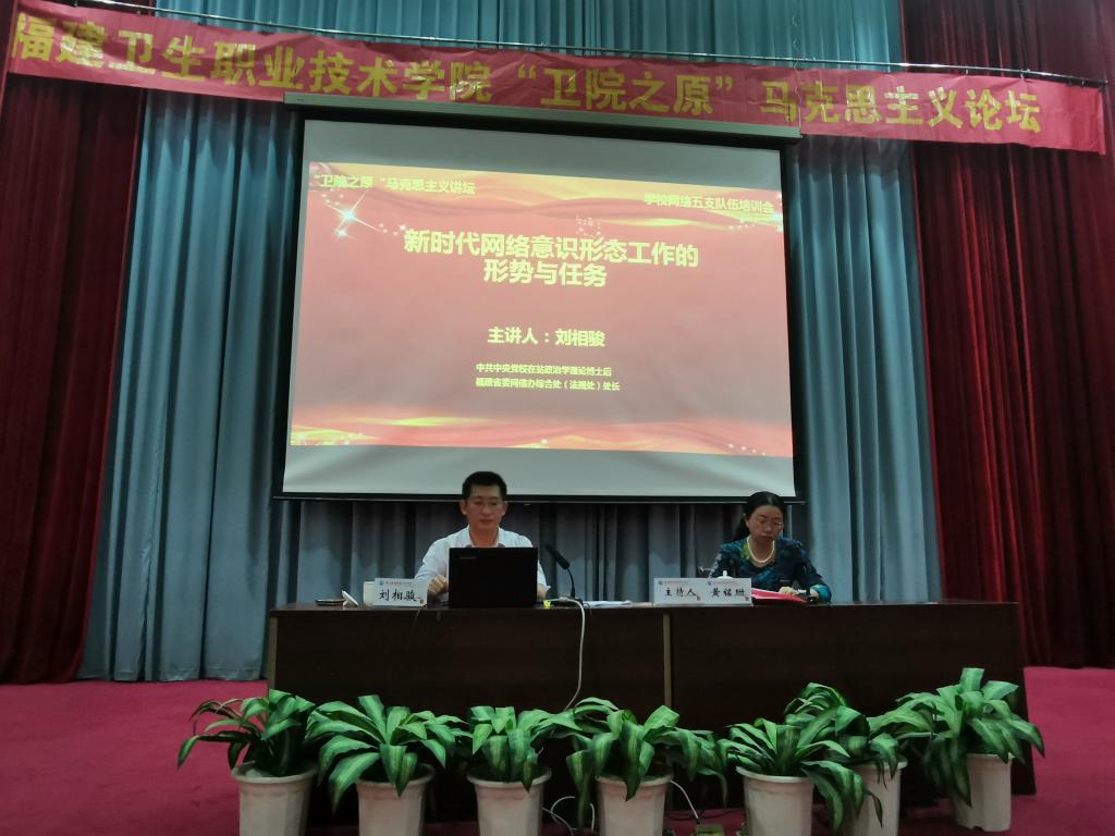 為扎實(shí)推進(jìn)“不忘初心、牢記使命”主題教育,深入學(xué)習(xí)“專題六:主動(dòng)擔(dān)當(dāng)作為,凝聚發(fā)展動(dòng)力”,2019年10月24日下午,我?!靶l(wèi)院之原”馬克思主義講壇在學(xué)術(shù)報(bào)告廳舉行。本次講壇邀請福建省委網(wǎng)信辦綜合處(法規(guī)處)劉相駿處長為我校師生做“新時(shí)代網(wǎng)絡(luò)意識(shí)形態(tài)工作的形勢和任務(wù)”的專題講座。講座由福建衛(wèi)生職業(yè)技術(shù)學(xué)院副院長黃銘珊主持,各系部黨總支副書記、各黨總支專職組織員、學(xué)生黨支部書記、輔導(dǎo)員、馬院全體教師、醫(yī)學(xué)技術(shù)學(xué)系學(xué)生代表、臨床醫(yī)學(xué)系學(xué)生代表以及社團(tuán)學(xué)生代表共420人參加了此次會(huì)議。