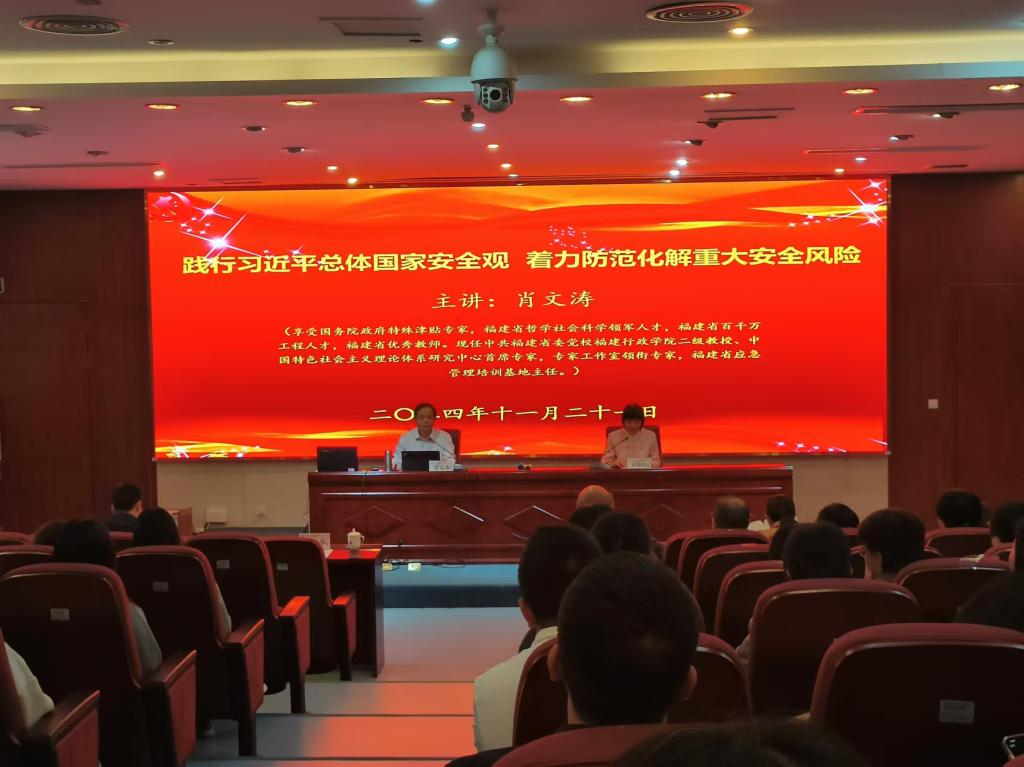 為深入學(xué)習(xí)貫徹黨的二十大、黨的二十屆三中全會(huì)精神,深刻理解和把握總體國(guó)家安全觀,2024年11月21日,馬克思主義學(xué)院第一黨支部在篤行樓四樓報(bào)告廳開展主題黨日活動(dòng),共同學(xué)習(xí)由國(guó)務(wù)院政府特殊津貼專家、福建省應(yīng)急管理培訓(xùn)基地主任、中共福建省委黨校福建行政學(xué)院肖文濤教授帶來的《踐行總體國(guó)家安全觀 著力防范化解重大安全風(fēng)險(xiǎn)》專題講座。