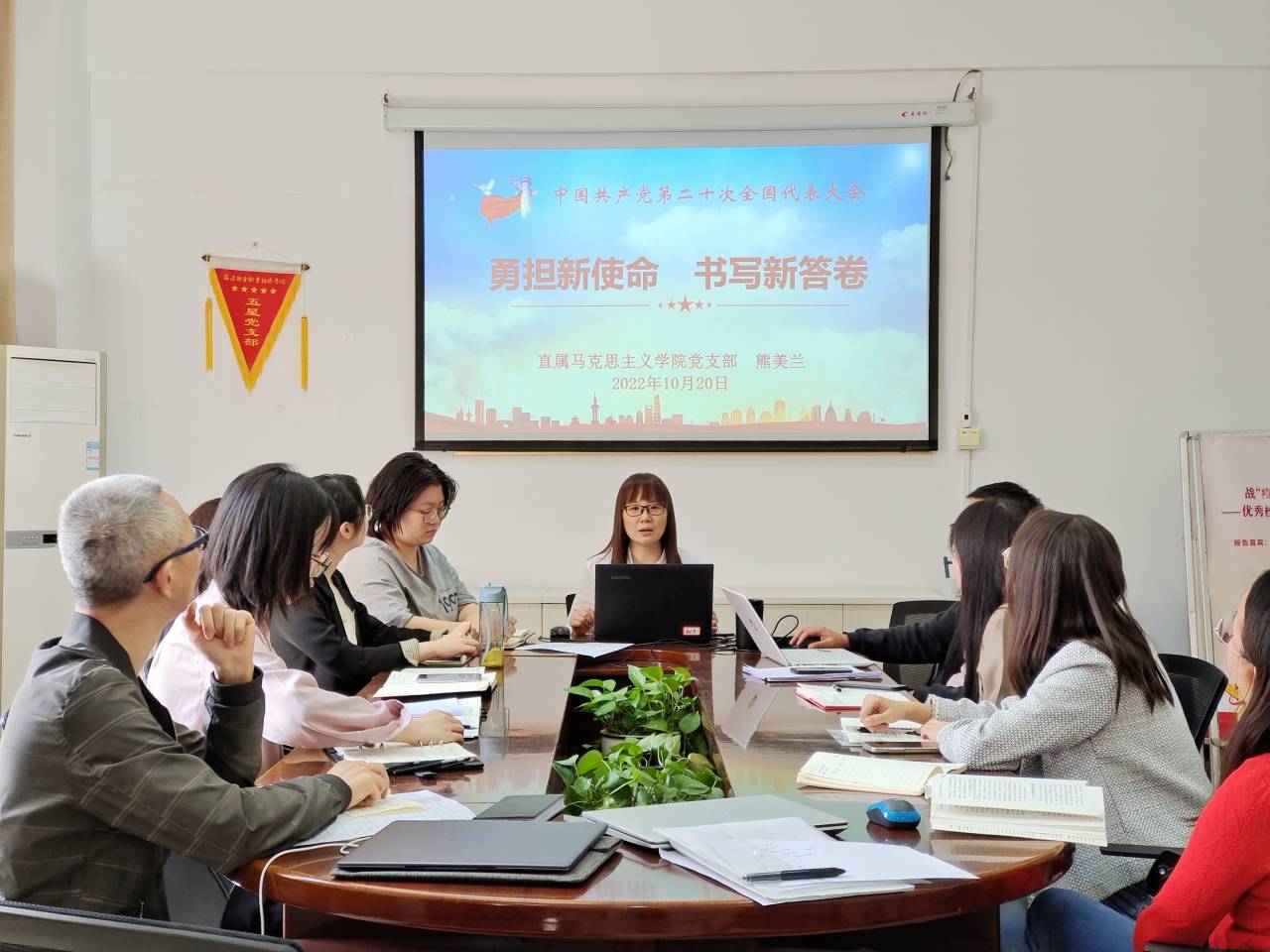 為學(xué)習(xí)宣傳和研究闡釋黨的二十大精神,用習(xí)近平新時代中國特色社會主義思想凝心鑄魂,引領(lǐng)新時代青年學(xué)生踔厲奮發(fā)、勇毅前行,2022年10月20日,直屬馬克思主義學(xué)院黨支部在會議室107開展黨的二十大報(bào)告專題研討會,活動由黨支部書記熊美蘭主持。
