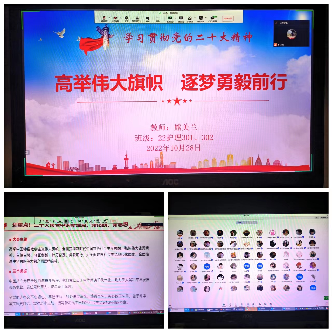 黨的二十大報(bào)告是我們黨團(tuán)結(jié)帶領(lǐng)全國(guó)各族人民在新時(shí)代新征程堅(jiān)持和發(fā)展中國(guó)特色社會(huì)主義的政治宣言和行動(dòng)綱領(lǐng)。為引導(dǎo)同學(xué)深入學(xué)習(xí)貫徹黨的二十大精神,全面貫徹習(xí)近平新時(shí)代中國(guó)特色社會(huì)主義思想,熊美蘭老師于2022年10月25日、28日,分別為21級(jí)“哲學(xué)與人生”選修課班,22級(jí)護(hù)理301、302班等近二百位學(xué)生作題為《高舉偉大旗幟 逐夢(mèng)勇毅前行》的專(zhuān)題宣講。