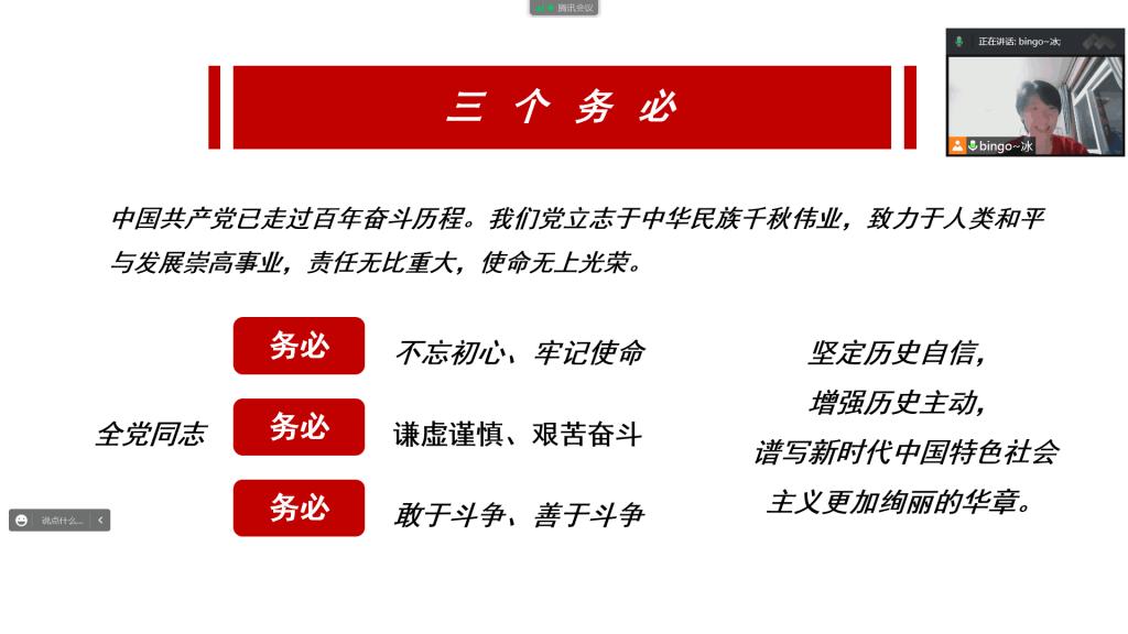 鄭冰首先介紹了大會(huì)的主題,引人入勝,明確同學(xué)們的學(xué)習(xí)方向。講述了中國(guó)共產(chǎn)黨走過(guò)的百年奮斗歷程,以及中國(guó)共產(chǎn)黨立志于中華民族千秋偉業(yè),致力于人類和平與發(fā)展的無(wú)上光榮的使命,據(jù)此引出全黨同志的三個(gè)務(wù)必和黨十年來(lái)所干的三件大事以及黨的中心任務(wù)。通過(guò)五個(gè)特色的描述,讓我們明確何為中國(guó)式現(xiàn)代化,以及前進(jìn)道路上我們必須牢牢把握的五個(gè)重大原則等重要內(nèi)容。