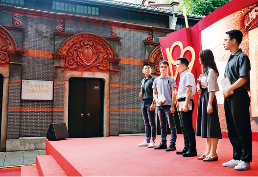 2020年6月29日,“新時代答卷人——上海市教育系統(tǒng)慶祝中國共產(chǎn)黨成立99周年暨學生愛國主義教育主題活動”在中共一大會址前舉行。來自復旦大學、同濟大學、上海建橋?qū)W院、上海市曹楊第二中學等8所學校的200余名師生代表參加活動,通過情景講述、現(xiàn)場教學、集體朗誦等形式,慶祝中國共產(chǎn)黨成立99周年,展現(xiàn)廣大上海學子的愛國情、強國志。圖為復旦大學師生代表在一大會址前展示情景教學。(新華社記者 劉穎/攝)