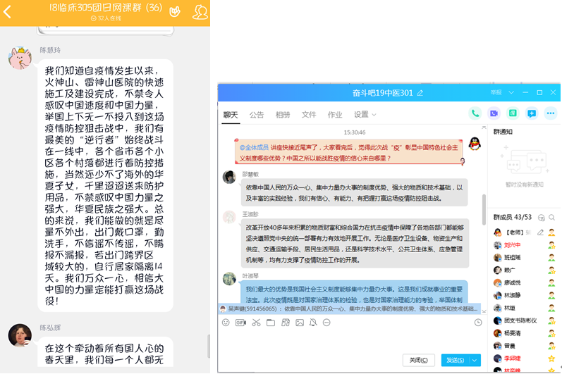 衛(wèi)院學(xué)子通過(guò)觀(guān)看疫情防控思政大課,結(jié)合自身實(shí)際,紛紛發(fā)表強(qiáng)烈感想?!白屛一匚稛o(wú)窮的是馮老師講的:我們最大的青春蛻變是走出孤芳自賞的‘小我’,走向擔(dān)當(dāng)民族復(fù)興責(zé)任的‘大我’,樹(shù)立責(zé)任意識(shí)與憂(yōu)患意識(shí)。作為一名醫(yī)學(xué)生,我應(yīng)該刻苦學(xué)習(xí),積蓄報(bào)國(guó)的本領(lǐng)和才干,將來(lái)做一名大愛(ài)無(wú)疆、德技雙馨的好醫(yī)生!”19級(jí)臨床醫(yī)學(xué)專(zhuān)業(yè)的鐘露同學(xué)感觸頗深?!包h堅(jiān)持以人民為中心,領(lǐng)導(dǎo)和依靠?jī)|萬(wàn)人民群眾,堅(jiān)定信心、同舟共濟(jì)、科學(xué)防治、精準(zhǔn)施策,展示了中國(guó)理念、中國(guó)速度、中國(guó)規(guī)模、中國(guó)效率,充分彰顯了中國(guó)特色社會(huì)主義的制度優(yōu)勢(shì),也更加堅(jiān)定了我入黨決心,以后我要處處嚴(yán)格要求自己,爭(zhēng)取早日入黨,那時(shí)候我也可以說(shuō)‘我是黨員,我先上’!”19藥品生產(chǎn)技術(shù)專(zhuān)業(yè)董馨同學(xué)如是說(shuō)?!澳嫘旭Y援,白袍加身,十七年前被保護(hù)的少年們,扛起了“白衣天使”的神圣使命。在新長(zhǎng)征路上的新時(shí)代青年,要擔(dān)起實(shí)現(xiàn)民族偉大復(fù)興的責(zé)任,展現(xiàn)青年擔(dān)當(dāng)!”18級(jí)護(hù)理專(zhuān)業(yè)廖琳欣同學(xué)表達(dá)自己的想法?!榜R上就要畢業(yè)踏入工作崗位了,未來(lái)的我一定不忘“業(yè)精德誠(chéng)”的校訓(xùn)和老師諄諄教誨,愛(ài)崗敬業(yè),用我所學(xué)治病救人、利國(guó)利民,并且讓患者感受到我發(fā)自?xún)?nèi)心的真善美,有時(shí)去治愈、常常去幫助、總是去安慰?!?7級(jí)學(xué)生動(dòng)情地說(shuō)。