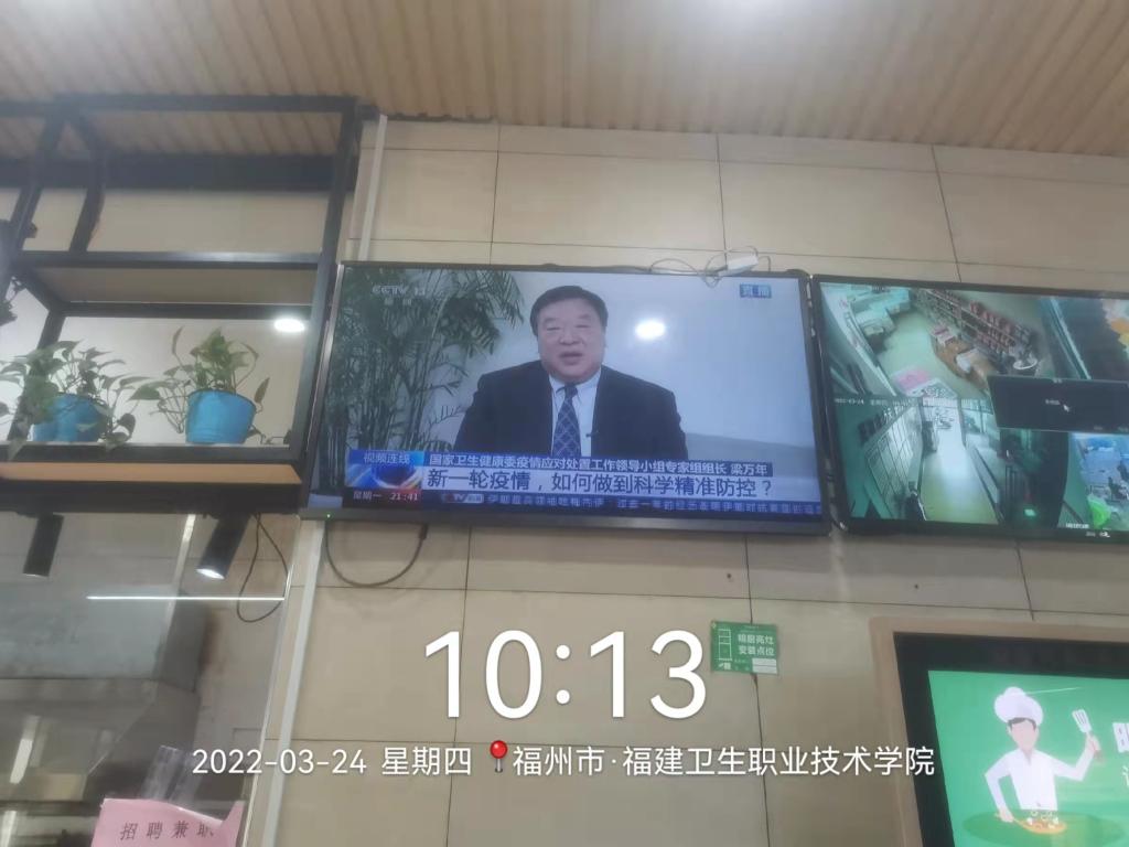 與此同時,督導(dǎo)各食堂大廳電視屏滾動播放防疫宣傳視頻,使廣大師生增強(qiáng)防疫意識,增長防疫知識。