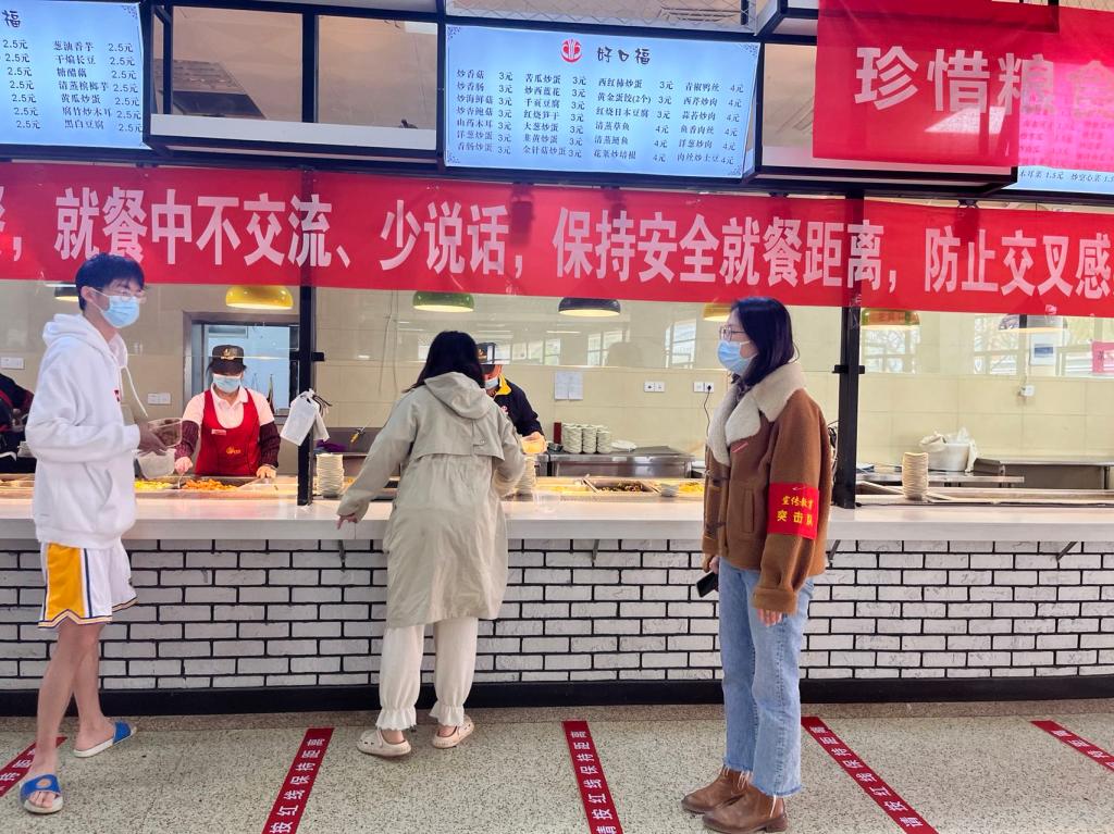 宣傳教育突擊隊(duì)在食堂、超市等校內(nèi)人流量大的區(qū)域迅速集結(jié),主動開展黨員志愿服務(wù),積極投入到秩序維護(hù)、防疫督導(dǎo)等各項(xiàng)工作中,以實(shí)際行動守護(hù)校園安全。