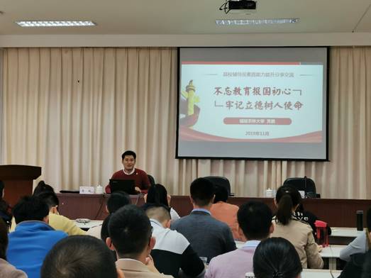 為提升我校輔導員的理論水平、專業(yè)素養(yǎng),促進輔導員工作的專業(yè)化、職業(yè)化,提高輔導員的素質(zhì)能力競賽水平,學工處特邀請曾獲第七屆全國高校輔導員素質(zhì)能力大賽三等獎、第七屆福建省高校輔導員素質(zhì)能力大賽一等獎的福建農(nóng)林大學優(yōu)秀輔導員黃鵬做主題為“牢記教育報國初心,不忘立德樹人使命”專題輔導員素質(zhì)能力提升講座。講座由學工處副處長林燕主持,全體專、兼職輔導員參加。