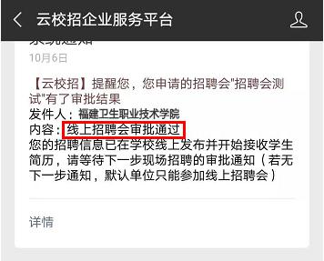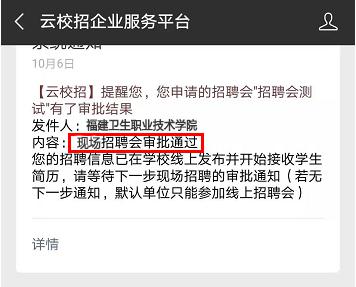就業(yè)中心集中審核校園招聘會(huì)報(bào)名申請,原則上在規(guī)定時(shí)間內(nèi)報(bào)名的用人單位,資質(zhì)審核合格的,都能獲得線上招聘資格,最終的現(xiàn)場招聘單位名單確定將依據(jù)學(xué)校的實(shí)際情況和畢業(yè)生的求職需求,審核結(jié)果將通過企業(yè)微信端(云校招企業(yè)服務(wù)平臺(tái))通知單位聯(lián)系人,審核結(jié)果分兩類: