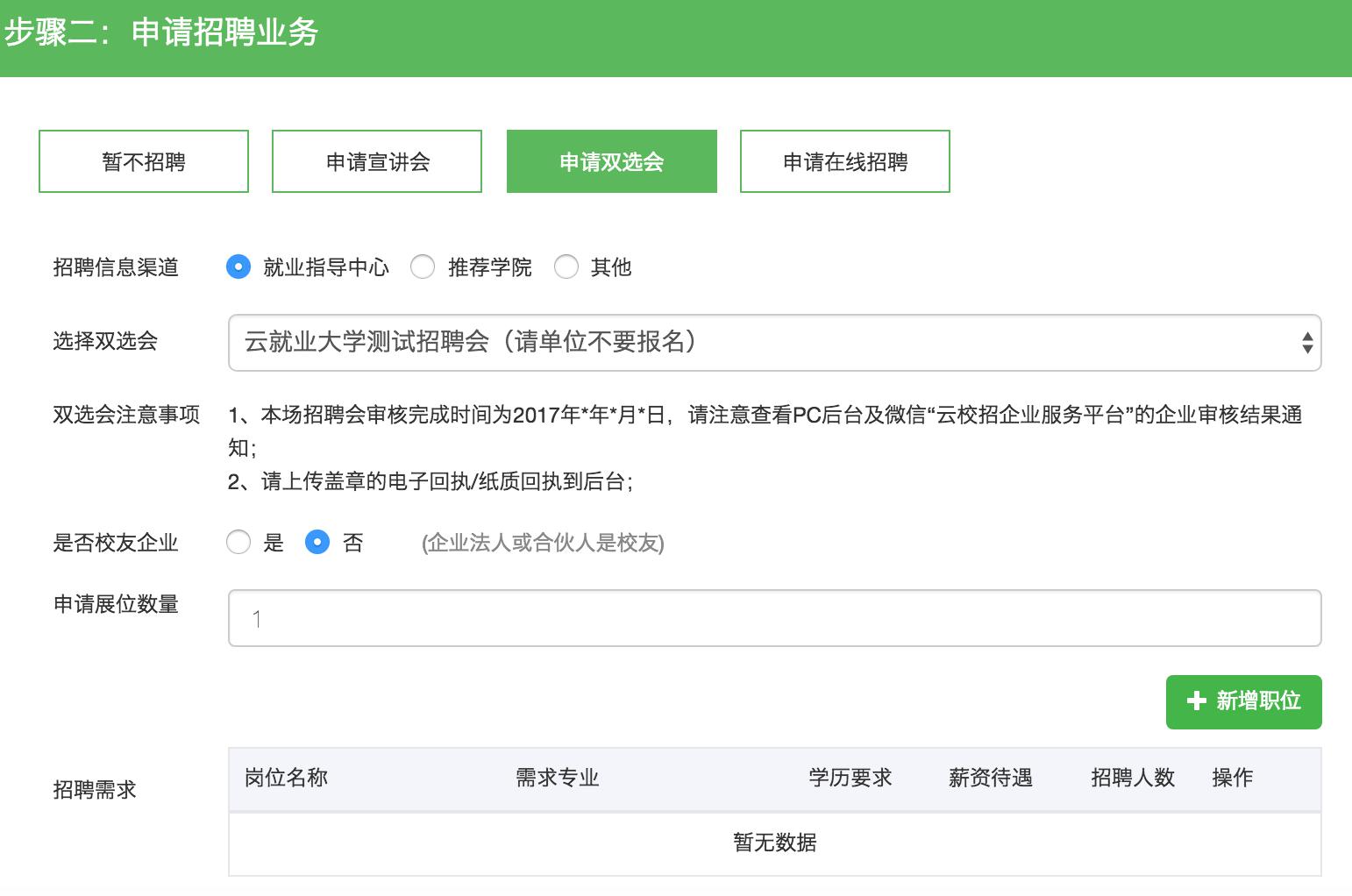 3.填完之后,點(diǎn)擊“下一步”,在“申請類型”中點(diǎn)擊“雙選會(huì)”,填寫參會(huì)資料,點(diǎn)擊“申請”。