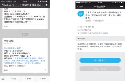 學(xué)生就業(yè)指導(dǎo)中心將通過企業(yè)微信端發(fā)送參會(huì)意向確認(rèn)通知給審核為“現(xiàn)場招聘”的單位(如圖1)。企業(yè)聯(lián)系人收到通知后,點(diǎn)擊通知,進(jìn)入確認(rèn)回復(fù)界面(如圖2)。