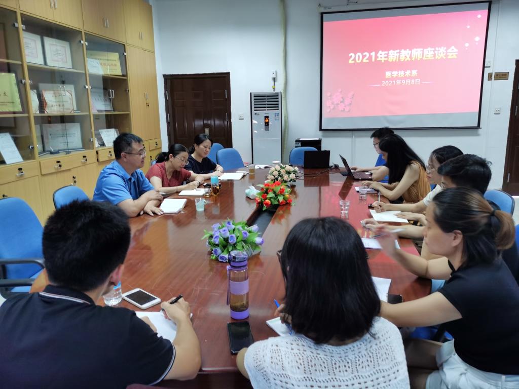 夏天的余熱還未褪去,金秋的風已徐徐吹來。2021年9月8日醫(yī)學技術(shù)系召開2021年新教師座談會。參加此次座談會的人員有:副校長黃銘珊、系主任翁繩和、黨總支書記陳俊穎、副主任鐘偉雄以及七位新入職教師。