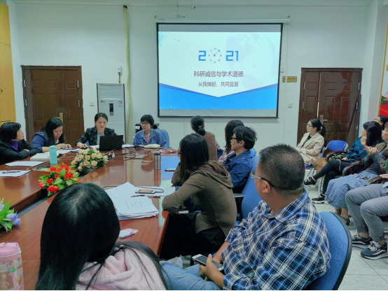 會中,醫(yī)學技術系黨總支書記陳俊穎帶領大家學習了《醫(yī)學科研誠信和相關行為規(guī)范》(國衛(wèi)科教發(fā)〔2021〕7號)、《科學技術活動違規(guī)行為處理暫行規(guī)定》(科學技術部令第19號)、《關于進一步弘揚科學家精神加強作風和學風建設的意見》等相關文件,重點強調了科研誠信、學術道德、學術規(guī)范、學術不端等四個方面具體內容,讓老師們對科研誠信建設的重要性有了更為全面的了解,并且對于科研處下達的科研誠信建設有關工作,陳俊穎也進行了詳細的部署安排,要求全體老師務必高度重視、積極配合,本著認真負責的態(tài)度,按時有效完成專項教育整治活動有關內容。