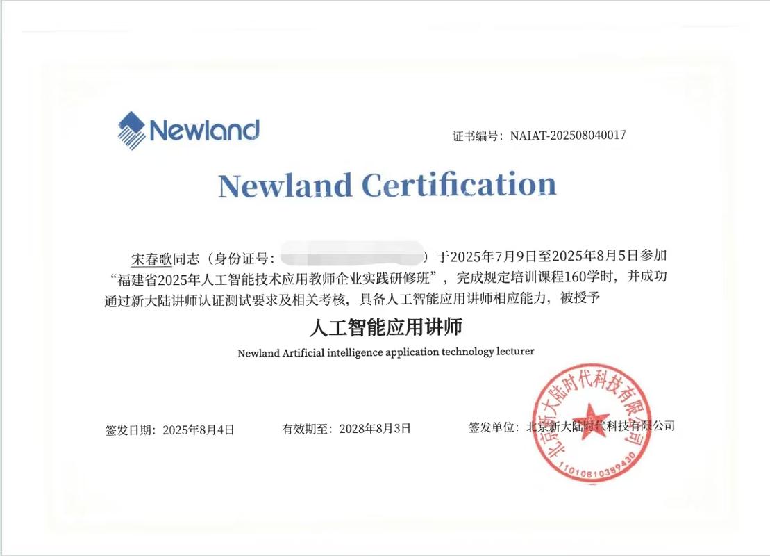值得一提的是,在嚴(yán)格考核后,宋春歌老師獲得了由新大陸科技有限公司頒發(fā)的“人工智能訓(xùn)練師(三級(jí))”證書及“人工智能應(yīng)用講師”證書。雙重認(rèn)證不僅是對(duì)教師技術(shù)能力與教學(xué)能力的權(quán)威認(rèn)可,也為職業(yè)院校申報(bào)“雙師型”教師、優(yōu)化專業(yè)師資結(jié)構(gòu)提供了有力支撐。