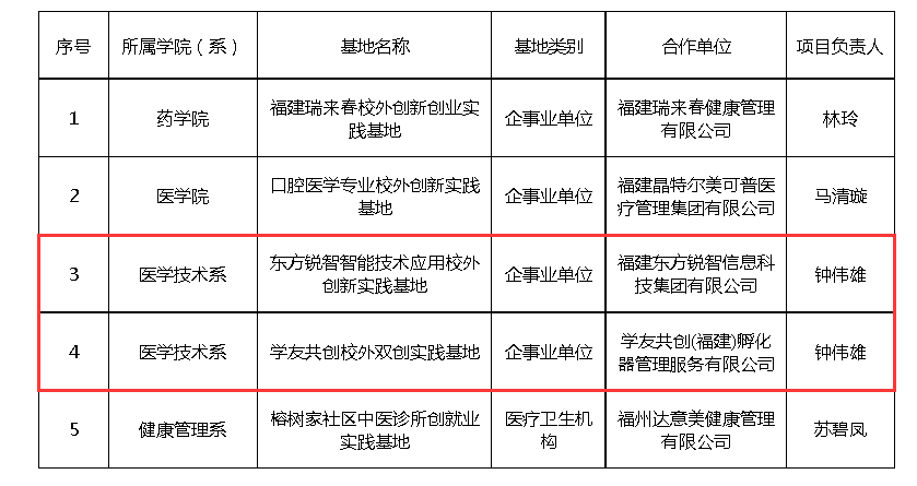 根據(jù)《福建衛(wèi)生職業(yè)技術(shù)學(xué)院校外創(chuàng)新創(chuàng)業(yè)實(shí)踐基地管理辦法(試行)》(閩衛(wèi)院教〔2023〕4 號(hào)),學(xué)校組織開(kāi)展2023年度校外創(chuàng)新創(chuàng)業(yè)實(shí)踐基地項(xiàng)目評(píng)選工作。經(jīng)各學(xué)院(系)積極申報(bào),教務(wù)處形式審查,專題會(huì)議討論并表決通過(guò),我系兩個(gè)基地入選建設(shè)項(xiàng)目名單。