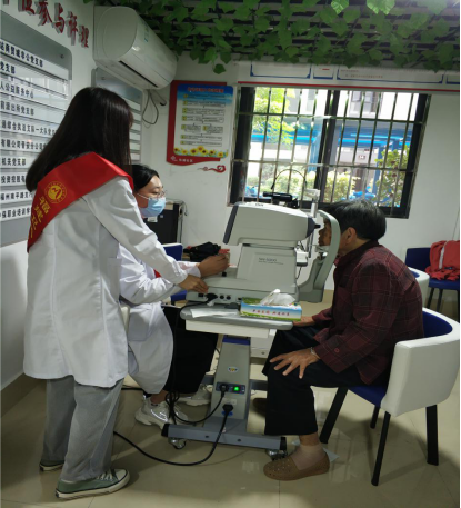 眼部疾病檢查,愛眼護(hù)眼在行動。眼視光技術(shù)專業(yè)的師生攜帶裂隙燈顯微鏡、非接觸性眼壓計、眼底照相機(jī)等專業(yè)設(shè)備,為社區(qū)居民開展眼部健康、眼前節(jié)及眼底等檢查,篩查年齡相關(guān)性白內(nèi)障和糖尿病視網(wǎng)膜病變。對義診中篩查出的眼部健康問題,師生們耐心指導(dǎo)社區(qū)居民愛眼護(hù)眼的方法,引導(dǎo)特殊情況及時就醫(yī)。