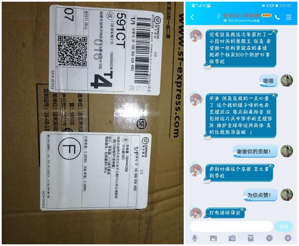 2020年3月24日,福建衛(wèi)生職業(yè)技術(shù)學院收到了一個快遞,里面有500個醫(yī)用口罩,而寄出這個包裹的正是19檢驗301班的郭林薇同學。郭同學把她生平第一次打工賺的錢全買了口罩寄給母校,希望能為學校防控新冠肺炎疫情盡點綿薄之力。