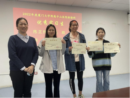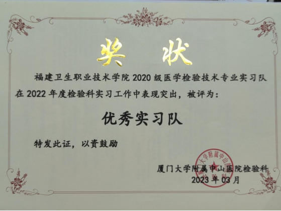 2023年3月30日,廈門大學(xué)附屬中山醫(yī)院檢驗科為2023屆實習(xí)生舉辦表彰大會,福建衛(wèi)生職業(yè)技術(shù)學(xué)院檢驗專業(yè)實習(xí)隊獲得“優(yōu)秀實習(xí)隊”稱號,20檢驗301班洪馨同學(xué)與20檢驗303班吳瑕同學(xué)獲評“優(yōu)秀實習(xí)生”。