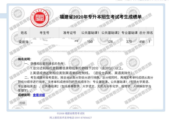 近日,2020年福建省普通高等教育專升本考試成績及錄取分數(shù)線公布,醫(yī)學技術(shù)系17級醫(yī)學檢驗技術(shù)專業(yè)學生梁麗萍,在今年醫(yī)學檢驗類招生計劃數(shù)少,考生多,競爭激烈的情況下,以總成績498分(滿分600分)的優(yōu)異成績成為福建省醫(yī)學檢驗類狀元!捷報傳來,全系師生歡欣鼓舞!