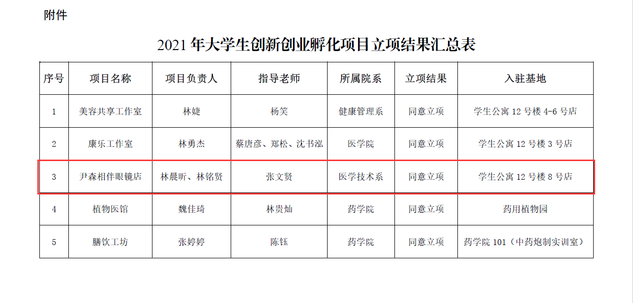 為充分發(fā)揮我校創(chuàng)新創(chuàng)業(yè)教育優(yōu)勢,提升人才培養(yǎng)質(zhì)量,鼓勵(lì)有志于自主創(chuàng)業(yè)并符合條件的大學(xué)生進(jìn)行創(chuàng)業(yè)實(shí)踐,打造學(xué)生創(chuàng)新創(chuàng)業(yè)實(shí)踐平臺,學(xué)校于2021年開展創(chuàng)新創(chuàng)業(yè)項(xiàng)目申報(bào)工作,經(jīng)院(系)申報(bào),校外專家評審、公示,學(xué)院審核,我系《尹森相伴眼鏡店》同意立項(xiàng)。