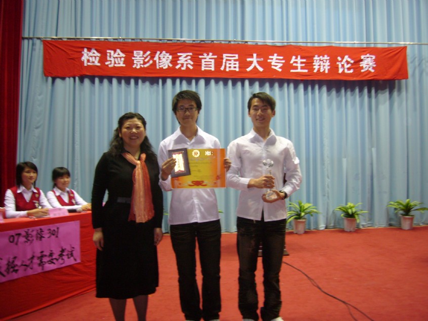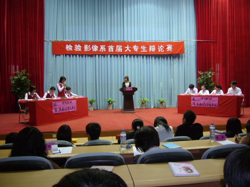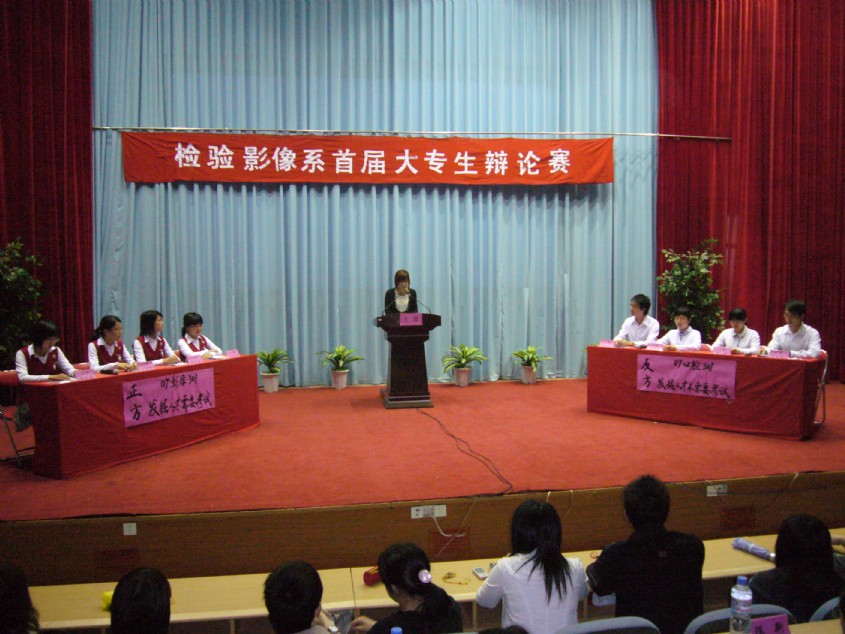 檢驗(yàn)影像系于4月17日下午4:00在院學(xué)術(shù)廳舉行“檢驗(yàn)影像系首屆大專生辯論賽”決賽。擔(dān)任此次比賽的評(píng)委是:學(xué)院副書記魏立娜老師、公共基礎(chǔ)部主任陳新老師、護(hù)理系書記謝濤老師、圖書館館長(zhǎng)鄭向紅老師、高教研究室朱扶蓉老師、公共基礎(chǔ)部黃秋蓮老師和圖書館伍麗萍老師。到場(chǎng)的嘉賓有學(xué)工處處長(zhǎng)鄭力宏老師、院團(tuán)委書記邱滾忠老師。 對(duì)決的雙方是07影像301班(正方)和07口腔301班(反方),正方的辯題是“發(fā)掘人才需要考試”,反方的辯題是“發(fā)掘人才不需要考試”,辯論賽分為立論、自由辯論,總結(jié)陳詞、觀眾提問等環(huán)節(jié)。正反辯手們邏輯嚴(yán)謹(jǐn),反應(yīng)敏捷,妙語如珠,針鋒相對(duì),盡己所長(zhǎng),展示了當(dāng)代大學(xué)生的風(fēng)采。最后,黃秋蓮老師對(duì)辯論賽進(jìn)行精辟的點(diǎn)評(píng)。 07口腔301班憑借整體實(shí)力和扎實(shí)的理論功底贏得了這場(chǎng)辯論賽,勇奪桂冠,07影像301班屈居亞軍;07口腔301班一辯林宇同學(xué)獲得總決賽最佳辯手的榮譽(yù)稱號(hào)。最后由魏立娜副書記為冠軍代表隊(duì)和最佳辯手頒獎(jiǎng),至此,檢驗(yàn)影像系首屆大專生辯論賽精彩謝幕。 此次辯論賽由檢驗(yàn)影像系學(xué)生會(huì)主辦,各班積極組建辯論隊(duì),為辯論賽進(jìn)行了長(zhǎng)期的備戰(zhàn),相繼參加了從3月18日至4月17日近一個(gè)月時(shí)間里舉行的4場(chǎng)初賽、2場(chǎng)半決賽以及決賽,在同學(xué)中掀起一股辯論旋風(fēng)。辯論賽不僅鍛煉了學(xué)生的思維、辯論的能力,而且將作為具有我系特色的素質(zhì)教育長(zhǎng)期開展,同時(shí)也為我院迎接人才水平評(píng)估營(yíng)造了良好的氛圍。