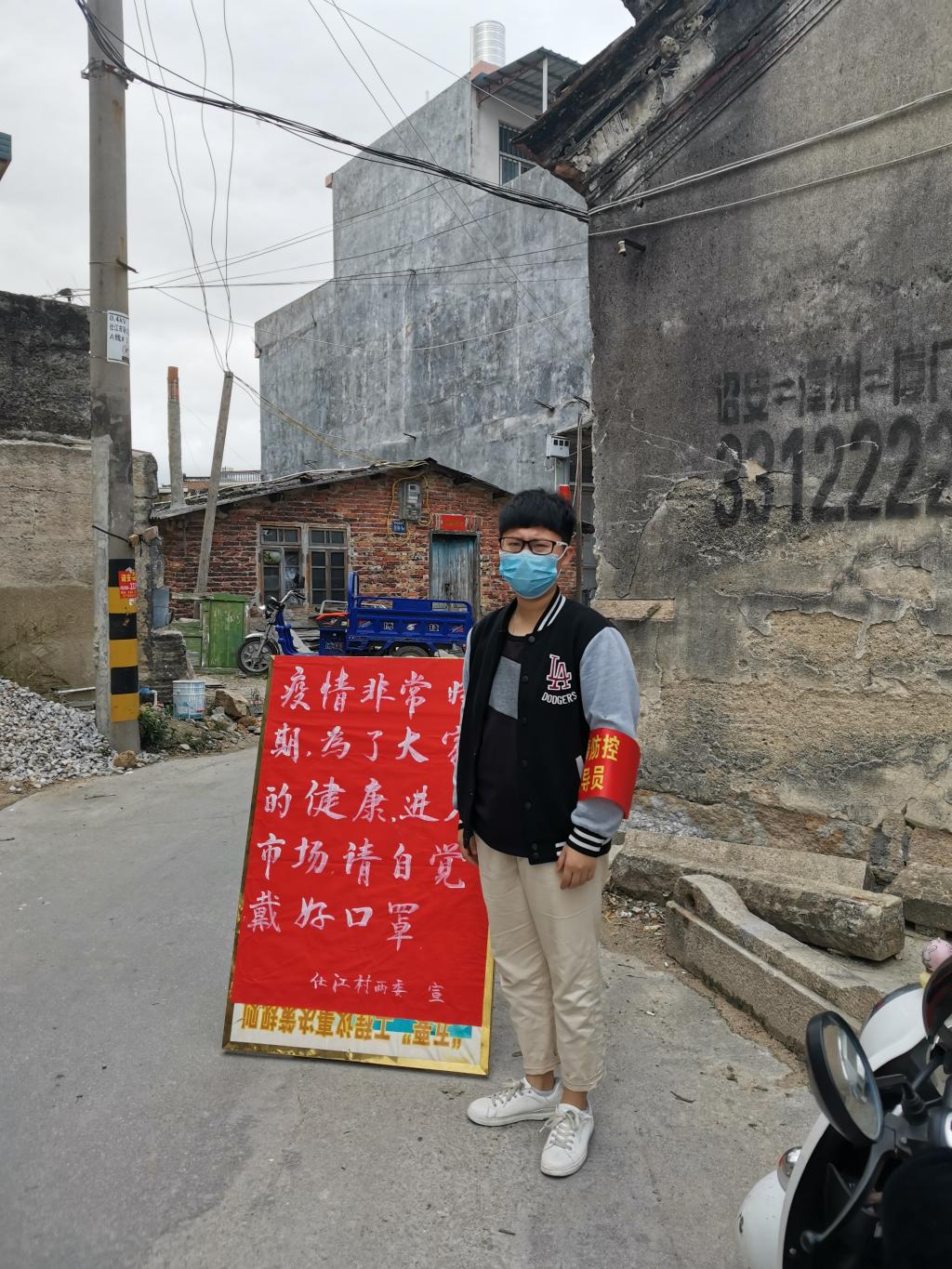 19影像301班沈曉棋同學(xué)在福建省漳州市詔安縣深橋鎮(zhèn)仕江村作為一名青年志愿者,在面對(duì)如此嚴(yán)重的疫情,自愿投入到戰(zhàn)斗中,共同戰(zhàn)“疫”!她在村里報(bào)名參加志愿服務(wù),服從村里的安排。在村路口登記外來車輛并進(jìn)行量體溫。她感言道:新冠肺炎時(shí)期,不去人流量大、人群聚集的地方。如果一定要外出,戴好口罩,做好防護(hù),勤洗手,養(yǎng)成良好的個(gè)人生活習(xí)慣,保護(hù)自己也是保護(hù)他人。健康是福,平安是樂。我相信我們能夠很快的結(jié)束這場(chǎng)戰(zhàn)“疫”!武漢加油!中國(guó)加油!