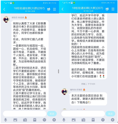 輔導(dǎo)員龍梅梅老師在團(tuán)日活動(dòng)中針對(duì)疫情做了分析,提醒同學(xué)們在家學(xué)習(xí),減少外出,提高警惕,保護(hù)好自己的安全。同學(xué)們手寫祝福語,用優(yōu)美的文字表達(dá)對(duì)祖國(guó)對(duì)武漢的祝福!羅沁琳同學(xué)說:“這次團(tuán)日雖然和之前的開展方式有所不同,但是意義非凡。輔導(dǎo)員在班會(huì)上為我們科普了新型冠狀病毒和防范它的知識(shí)以及現(xiàn)在的疫情情況,還關(guān)注我們的學(xué)習(xí)情況,鼓勵(lì)大家在疫情期間也要努力學(xué)習(xí)。我們也用手寫字,表達(dá)了對(duì)武漢同胞們的祝福,相信只要我們堅(jiān)定信心就一定能夠打贏這場(chǎng)防疫攻堅(jiān)戰(zhàn)!”