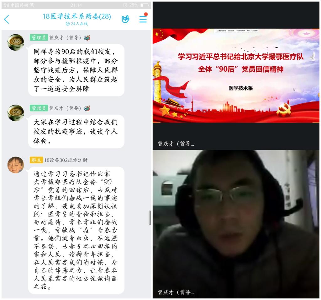 2020年3月15日,習(xí)近平總書記給北京大學(xué)援鄂醫(yī)療隊全體“90后”黨員回信。為了深入學(xué)習(xí)習(xí)近平總書記回信精神,教育同學(xué)奮斗青春,書寫人生絢麗篇章,發(fā)揚(yáng)愛國主義精神,我系團(tuán)總支書記曾慶才老師主持召開學(xué)生干部線上會議,各團(tuán)支部于3月17日在線上開展以“平‘語’近人,激勵青春”為主題的特別團(tuán)日活動。