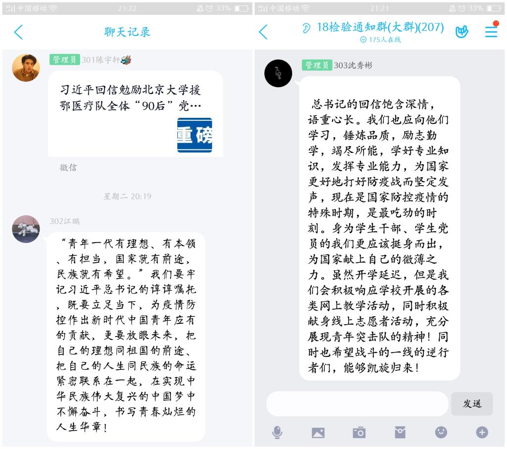 活動開始,各班團(tuán)支書點名,并帶領(lǐng)全班同學(xué)唱團(tuán)歌。團(tuán)支書以閱讀文章和閱讀習(xí)近平總書記回信內(nèi)容的方式向同學(xué)們傳達(dá)團(tuán)日內(nèi)容。習(xí)近平總書記的回信內(nèi)容及我校校友的抗疫事跡,在同學(xué)中引起熱烈反響。同作為“90后”的我們,倍受鼓舞,雖不能同前輩一起參與抗疫一線,英勇奮戰(zhàn),但我們會以他們?yōu)榘駱?,不懼風(fēng)雨,勇挑重?fù)?dān),用實際行動綻放青春之花。正如習(xí)近平總書記回信中所說,在校師生也應(yīng)以他們?yōu)榘駱?,在屬于自己的?zhàn)線上,沖鋒在前,練就本領(lǐng),服務(wù)人民,堅決打贏這場防疫阻擊戰(zhàn)。