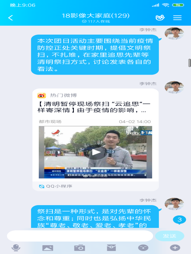 在全國(guó)上下眾志成城、堅(jiān)決打贏疫情防控人民阻擊戰(zhàn)之際,為銘記革命先烈,緬懷為戰(zhàn)“疫”而犧牲的最美“逆行”者,傳承中華民族傳統(tǒng)文化,踐行社會(huì)主義核心價(jià)值觀,我系各班團(tuán)支部于3月31日以QQ直播等方式開展以“網(wǎng)上祭英烈,防疫思英雄”為主題的團(tuán)日活動(dòng),倡導(dǎo)同學(xué)們響應(yīng)國(guó)家號(hào)召,開展“云”祭掃,做到“足不出戶”瞻仰英雄烈士。