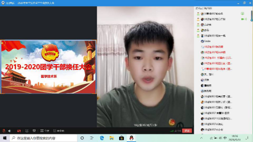 5月31日下午7:30,醫(yī)學(xué)技術(shù)系成功舉辦2019-2020學(xué)年團學(xué)干部換任大會。由于受疫情的影響,因此采取線上的形式召開本次換任大會。應(yīng)邀出席本次大會的領(lǐng)導(dǎo)老師有醫(yī)學(xué)技術(shù)系黨總支負(fù)責(zé)人邱滾忠副書記、我系團總支書記曾慶才老師、副書記方新榮老師、各班輔導(dǎo)員、兩委會干部及班級學(xué)生代表出席了本次大會。