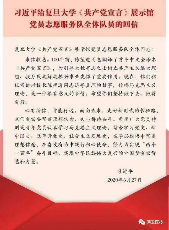 中共中央總書(shū)記、國(guó)家主席、中央軍委主席習(xí)近平于6月27日給復(fù)旦大學(xué)《共產(chǎn)黨宣言》展示館黨員志愿服務(wù)隊(duì)全體隊(duì)員回信,勉勵(lì)青年黨員們堅(jiān)持傳播馬克思主義理論,發(fā)揚(yáng)尋求真理的精神,并對(duì)廣大黨員提出殷切期望。