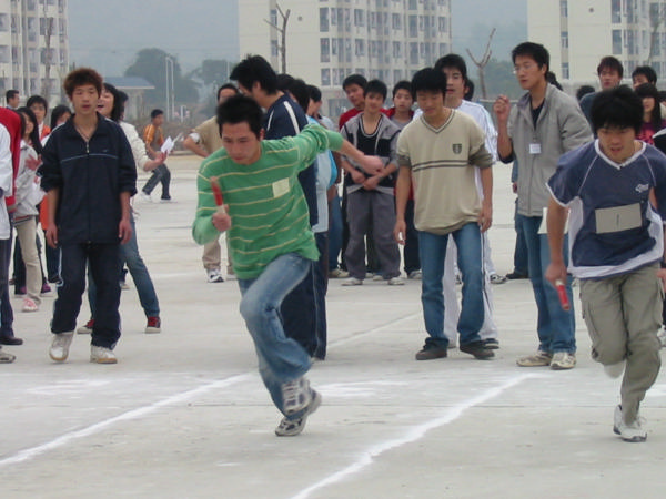 2006年3月7日下午體育部在運(yùn)動(dòng)場(chǎng)上舉行了往返接力賽,每班派男、女各一隊(duì)運(yùn)動(dòng)員參加。同學(xué)們?cè)谶\(yùn)動(dòng)場(chǎng)上積極參與,啦啦隊(duì)在運(yùn)動(dòng)場(chǎng)邊高喊加油,氣氛異常熱烈。最后決出了一等獎(jiǎng)一名,二等獎(jiǎng)二名,三等獎(jiǎng)三名。