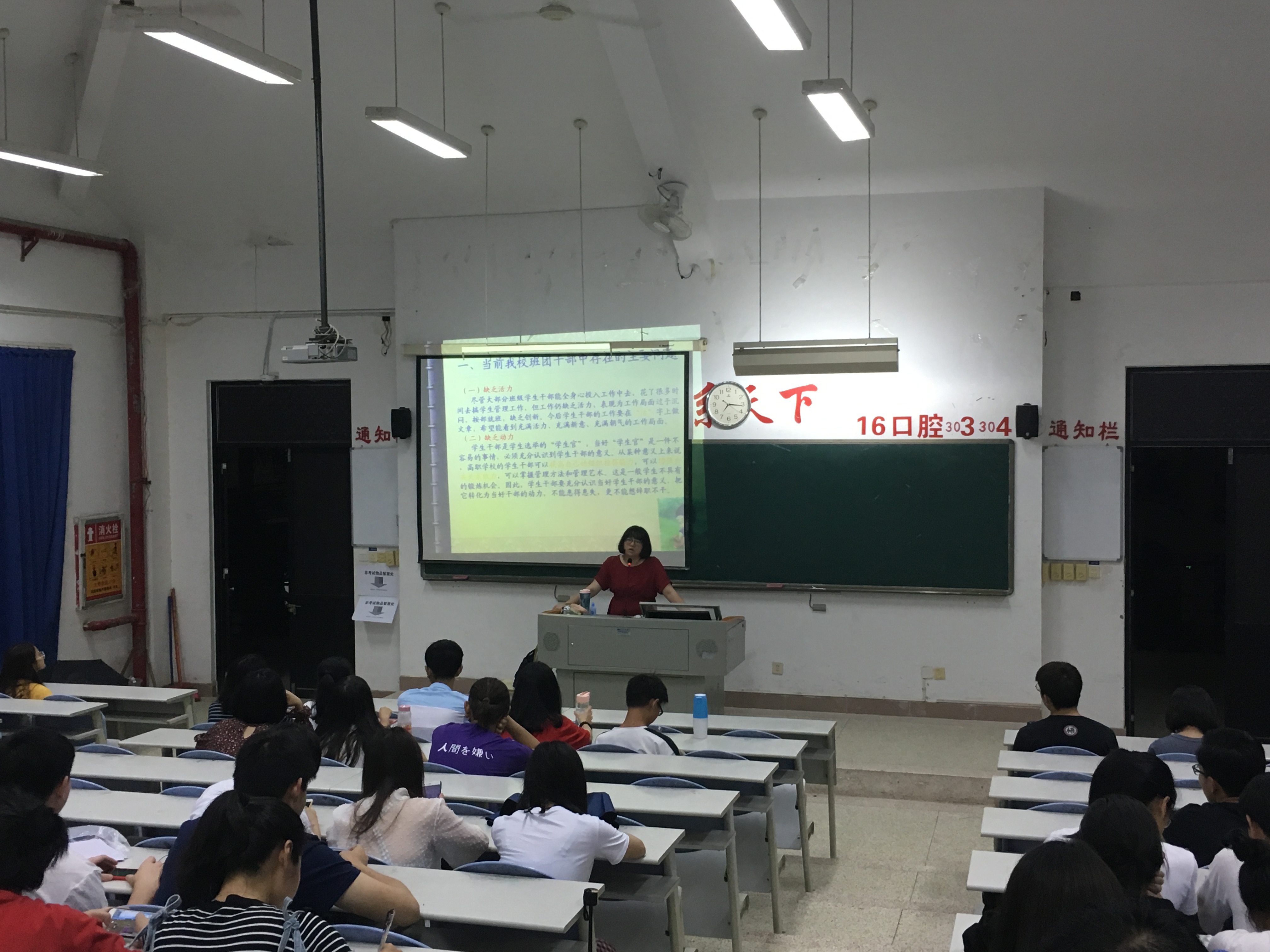 課堂上,陳念文老師從當(dāng)前我校班團(tuán)干部存在的主要問(wèn)題、面臨的對(duì)象特點(diǎn)以及班團(tuán)干部的工作方法三個(gè)方面進(jìn)行總結(jié),指出學(xué)生干部全身心投入到工作中去,但工作上仍缺乏活力、動(dòng)力、合力、能力以及魄力;同時(shí),學(xué)生干部群體基礎(chǔ)良莠不齊,兩極分化,思想活躍,自我表現(xiàn)意識(shí)強(qiáng)但政治意識(shí)弱,也缺乏大局意識(shí)、集體榮譽(yù)感和責(zé)任感。陳念文老師認(rèn)為,目前學(xué)生干部的工作局面過(guò)于沉悶,按部就班,缺乏創(chuàng)新,希望能開(kāi)創(chuàng)充滿活力、充滿新意、充滿朝氣的工作局面。最后,陳念文老師為學(xué)生總結(jié)學(xué)習(xí)文件和工作手冊(cè),強(qiáng)調(diào)調(diào)查研究要做好計(jì)劃和總結(jié),并分享做到統(tǒng)一布局、分工協(xié)作、增進(jìn)班級(jí)團(tuán)結(jié)、兼顧學(xué)習(xí)與工作的諸多良方。
