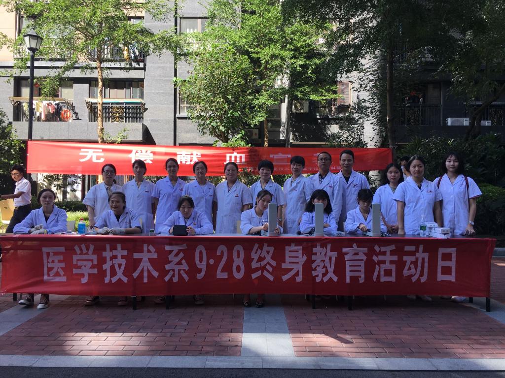 為做好2019年“9.28終身教育活動(dòng)日”暨全民終身學(xué)習(xí)活動(dòng)周,宣傳終身教育思想,樹立終身學(xué)習(xí)理念,激勵(lì)終身學(xué)習(xí)熱情,充分發(fā)揮醫(yī)學(xué)職業(yè)技能優(yōu)勢,突出我院辦學(xué)特色和成果,進(jìn)一步加強(qiáng)基層服務(wù)型黨組織建設(shè),充分發(fā)揮黨員模范帶頭作用,醫(yī)學(xué)技術(shù)系黨總支于2019年9月19日下午2點(diǎn)在閩侯世茂小區(qū),結(jié)合“不忘初心、牢記使命”主題教育,緊貼人民群眾需求和當(dāng)?shù)貙?shí)際,開展無償獻(xiàn)血宣教活動(dòng),15名黨員教師和20名學(xué)生參與了此次活動(dòng)。
