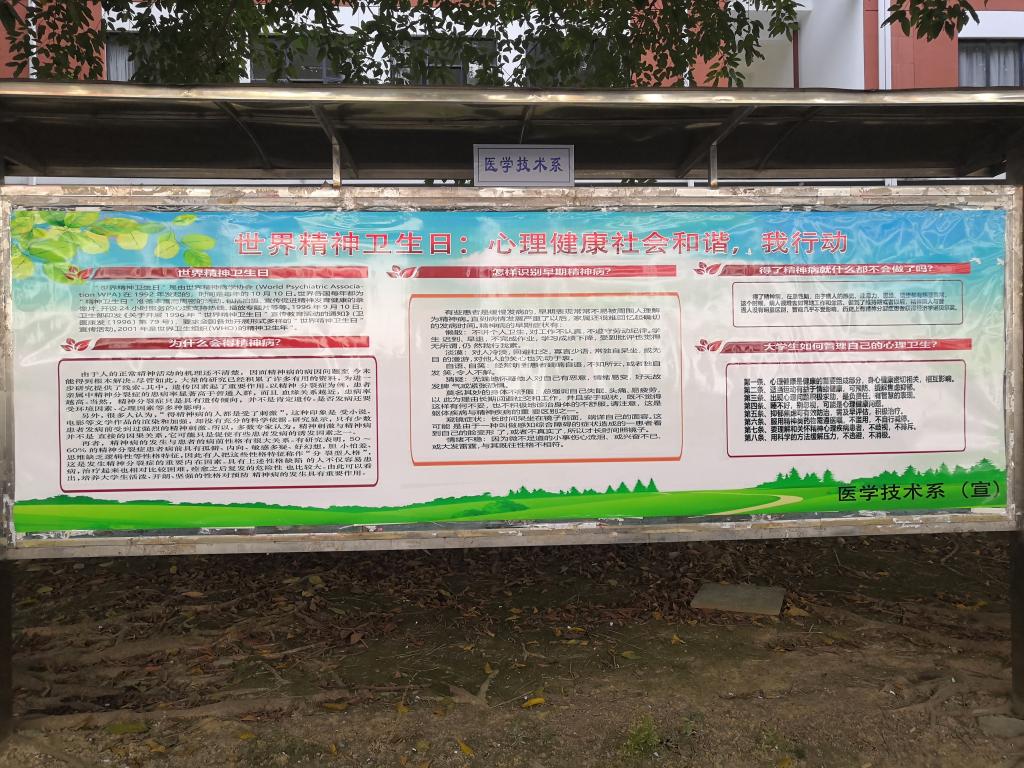 每年10月10日為“世界衛(wèi)生精神日”,為增進同學(xué)們的心理健康水平,促進對精神疾病的認識和理解,消除偏見與歧視,醫(yī)學(xué)技術(shù)系于2019年10月10日開展“關(guān)愛精神健康,共建和諧閩衛(wèi)”主題宣傳活動。